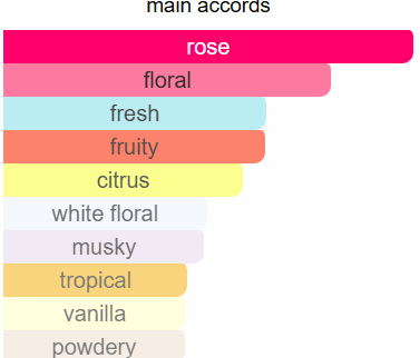 Its notes are intoxicating and incorporate black currant, pink grapefruit, mandarin, lily of the valley, rose, litchi, peony, Madonna lily, along with ambrette seed, sandalwood, musk and vanilla.